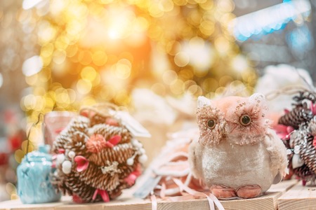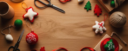 preparation for christmas celebration on brown table with some copy space. handmade toys for decorating traditional christmas tree
