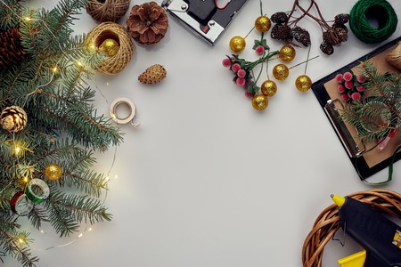 Christmas background with decorations, garland and pine cones. Creating wreath made of christmas tree branches on white background.