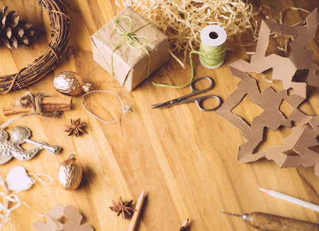 Christmas composition, zero waste trend with recycled craft packaging and wooden decorations, ecological new year holiday concept, home homemade decor, top view,