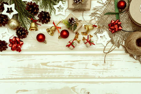 Cozy vintage toned winter holidays Christmas Composition with Gifts Boxes and Balls, Pine Cones Wooden Background. Styled photography for blog posts. Flat lay top view.