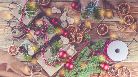 Zero waste Christmas, eco background with gifts. Craft paper and wood. Xmas and New Year composition.
