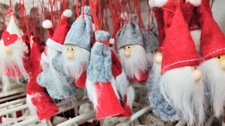 Christmas santa Claus cloth gnomes Handmade decorations at christmas market Christmas decorations and little markets. Merry christmas, cute festive decoration close up, beautiful toys for new year