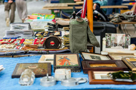 Many various items being sold on outdoor flee market. Ljubljana, Slovenia.