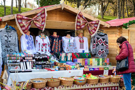 Bucharest, Romania - 28 November 2021: Traditional decorations and gifts displayed for sale at Christmas Market in Drumul Taberei Park (Parcul Drumul Taberei) known as Moghioros, in a sunny day
