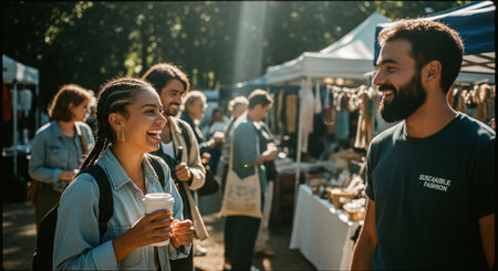A lively outdoor market scene with people engaging in conversation, showcasing sustainable fashion products, bright sunlight filtering through trees