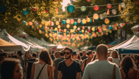Someone enjoying a summer festival with crowds of people and colorful decorations. with Generative AI