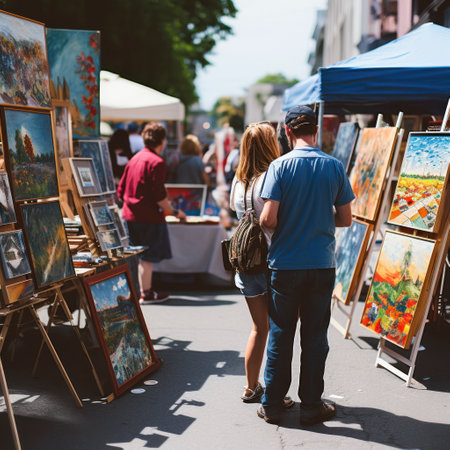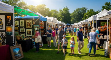 A bustling outdoor art fair on a sunny day, with people, including a family, browsing paintings, sculptures, and crafts displayed in white tents. The event is set on a grassy park, representing community, culture, and small business.