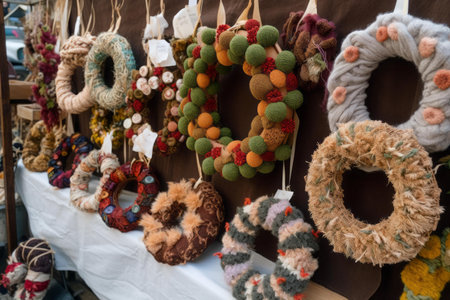 Handmade wreaths different stall town. Xmas europe retail fabric. Generate Ai