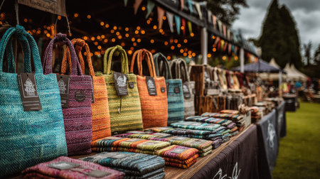 A vibrant display of handcrafted bags and textiles showcases the artistry of local artisans. The outdoor market setting, adorned with twinkling lights, creates a warm and inviting atmosphere.