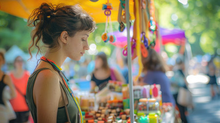 A woman adorned with earrings is enjoying the colorful display at a market in the city. Her fashion accessories add a touch of glamour to the vibrant event, attracting a crowd of onlookers AIG50