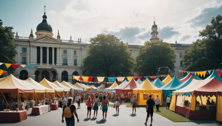 A vibrant summer festival with attendees exploring market stalls in front of a grand historic building on a clear day.. AI Generation