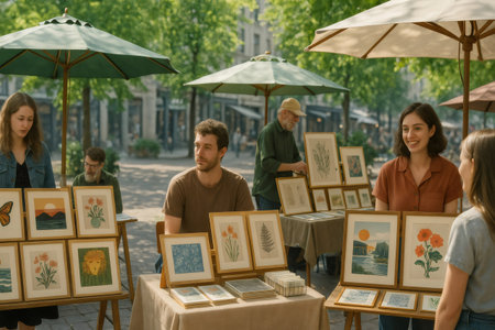 Vendors and customers engaging in lively exchanges of linocut prints and illustrations at a vibrant open air art market on a sunny day