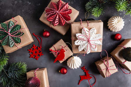 Christmas gift boxes decorated with red, green, white snowflakes made of paper on a gray background.