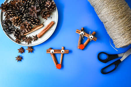Top view of making Christmas decoration. Deer from cinnamon sticks. Children's art project, a craft for children. DIY concept. Step by step 4. Natural Christmas handmade decorations