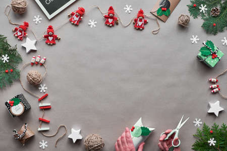 Zero waste Christmas frame with copy-space. Flat lay, top view on brown craft paper. Textile trinkets, thuja twig, paper gift boxes and scissors in hands. Paper stars, greeting tags. Eco friendly Xmas