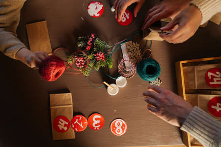 Close-up top view of happy family making Christmas advent calendar together sitting at table in cozy house on xmas Eve. Father, mother and son enjoying togetherness preparing for holidays at home.