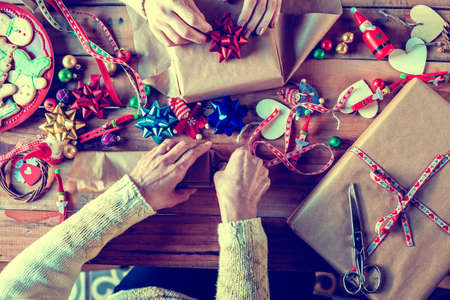 Kuala Lumpur, Malaysia - December 2020: Preparing for Christmas. Young Asian hands pack a gift