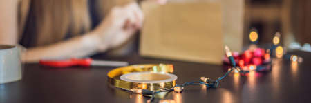 Christmas present in box. Eco friendly set. Zero Waste Ney Year Space for your greetings. Banner