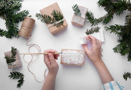 Hands hold one Christmas present and decorate it with white paint on desktop