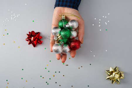 Top view of a heap of New Year balls in female hands on blue backround made of festive decorations. Christmas time concept.