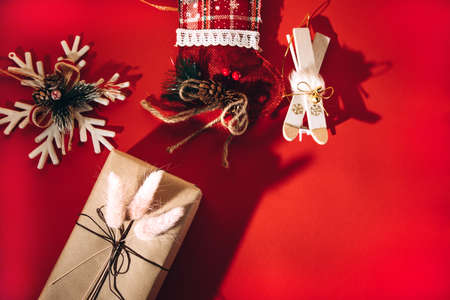 Bag red in a gift box made of craft paper against the background of Christmas decor. New Year 2022 wrapping gift concept