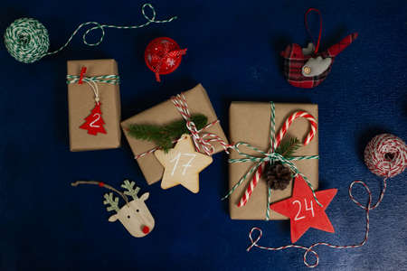 Christmas composition. Gifts, red decorations on blue background. Christmas,new year concept. Flat lay, top view