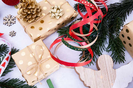 Christmas decorations, festive packaging, boxes with gifts lie on the table on a white background