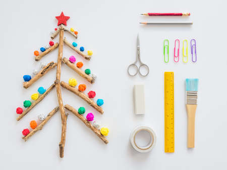 Diy Merry Christmas deer on greeting card postcard made of pebbles, sea stones, clothespins and branches on white background. Natural Eco style diy. Gift idea. Step by step. Top view. Process kid children craft. Do it yourself