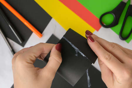 Professional woman decorator, designer working with kraft paper, applying glue and making envelope at workshop, studio - close up shot of woman hand. Design, handmade and art concept