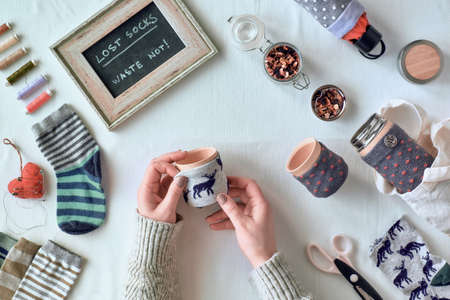 Zero waste household. Making bamboo cup and thermos can sleeve out of stray socks. Upcycling of orphaned mismatched socks. Flat lay on textile tablecloth. Low impact sustainable lifestyle.
