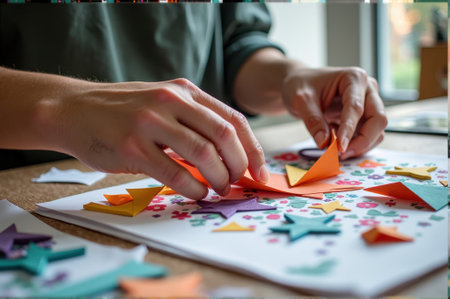 Close-up of hands crafting colorful origami on decorative paper. That the image is generated using AI.