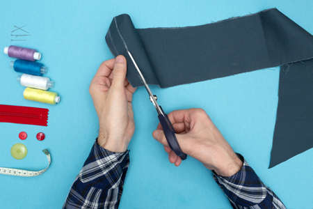 The tailor cuts the fabric. Sewing accessories. Self-development at home. Creating a pattern for sewing clothes.