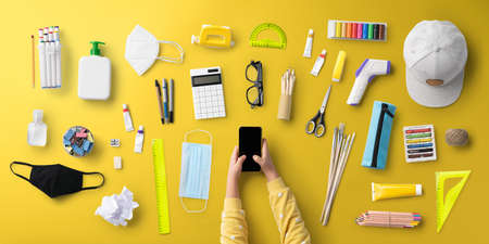 Flat lay top view of child, face mask and school supplies, back to school and coronavirus concept.