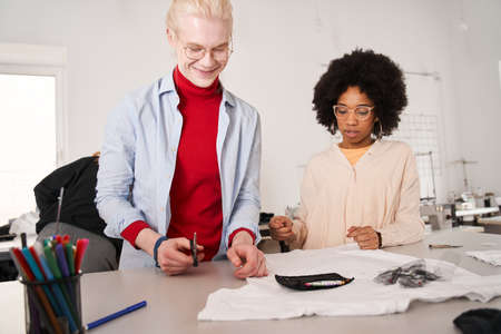 Woman looking attentively at the t shirt and listening ideas from her colleague