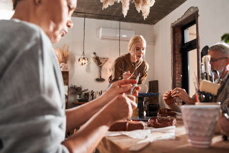 Elderly people making products from clay and listening their teacher at the creative space