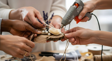 Multiple pairs of hands collaborate on a creative project, using a hot glue gun to assemble rustic wedding decor featuring burlap, wood slices, lavender, and a small flower. The image conveys teamwork, crafting, and the creation of handmade gifts or decorations.