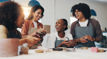 Woman, pottery and teacher with group, happy or sculpture for art, development or process for results. People, coach and laugh for creativity, excited or learning with diversity in course at workshop