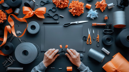 A person is working on a craft project with various materials, including scissors, ribbons, and other items. Concept of creativity and focus as the person carefully handles the materials
