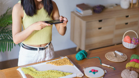 Needlework concept, Women use phone taking photo of embroidery fabric punch frame diy performance.