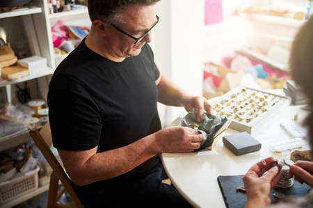 two contemporary working together in jewelry workshop. Master and apprentice. Young male assistant and female jeweler are working together at jewelry making workshop.