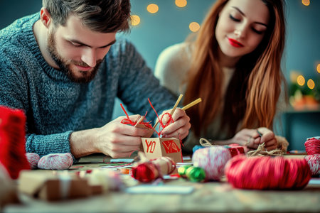 A couple enjoys crafting with colorful threads and materials at a table filled with festive decorations.