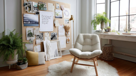 A serene workspace with a bulletin board full of inspirational quotes photographs and designs complemented by a comfortable chair and a soft rug inviting creativity