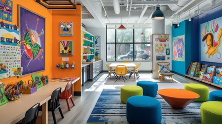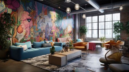 A vibrant modern workspace featuring colorful murals, stylish furniture, and an inviting atmosphere ideal for creativity and collaboration. Perfect for team meetings.