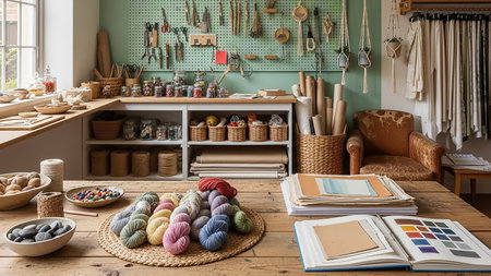 A cozy artistic workshop filled with tools and supplies, showcasing creativity and inspiration in a well-organized space bathed in natural light.