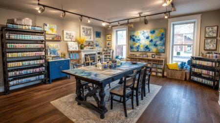 A bright and inviting art studio filled with organized supplies, natural light streaming through large windows, and a warm creative atmosphere perfect for artistic endeavors.