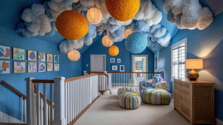 A vibrant children's playroom featuring bright blue walls, imaginative cloud-like decorations, and cozy seating arrangements that inspire creativity and play.