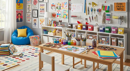 A charming craft room with colorful supplies neatly organized, a pegboard for tools, and inspirational artwork on the walls.
