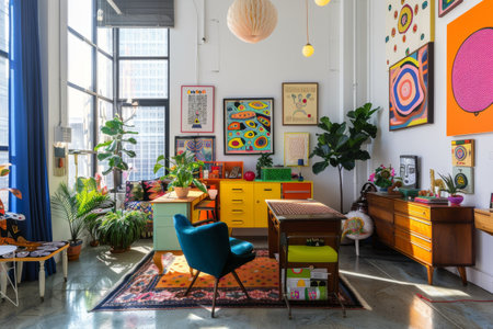 This vibrant home office features colorful wall art and cozy furnishings, creating an inspiring environment perfect for creativity and productivity in modern design.