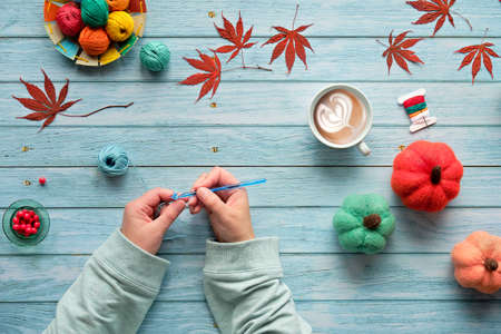 Woman hands kniting crochet. Top view of the wooden table with yarn balls, wool bundles, decorative Fall felt pumpkins, Autumn leaves. Seasonal flat lay on aged light blue wood.