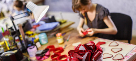 brown-haired woman manufacturing heart-shaped red purses under the lamp. purses are in focus. blurred background.